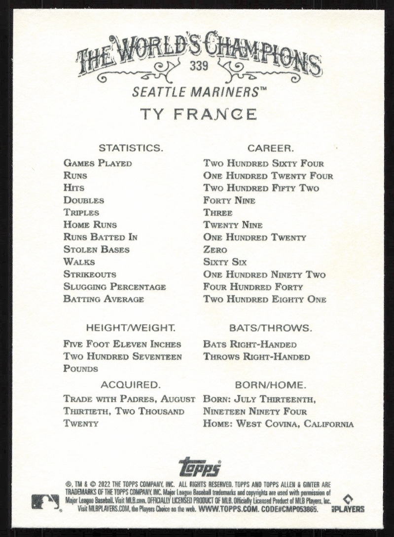This Baseball card, from 2022 is part of the Topps Allen & Ginter card set. Ty France is featured and has a card number of 339.
