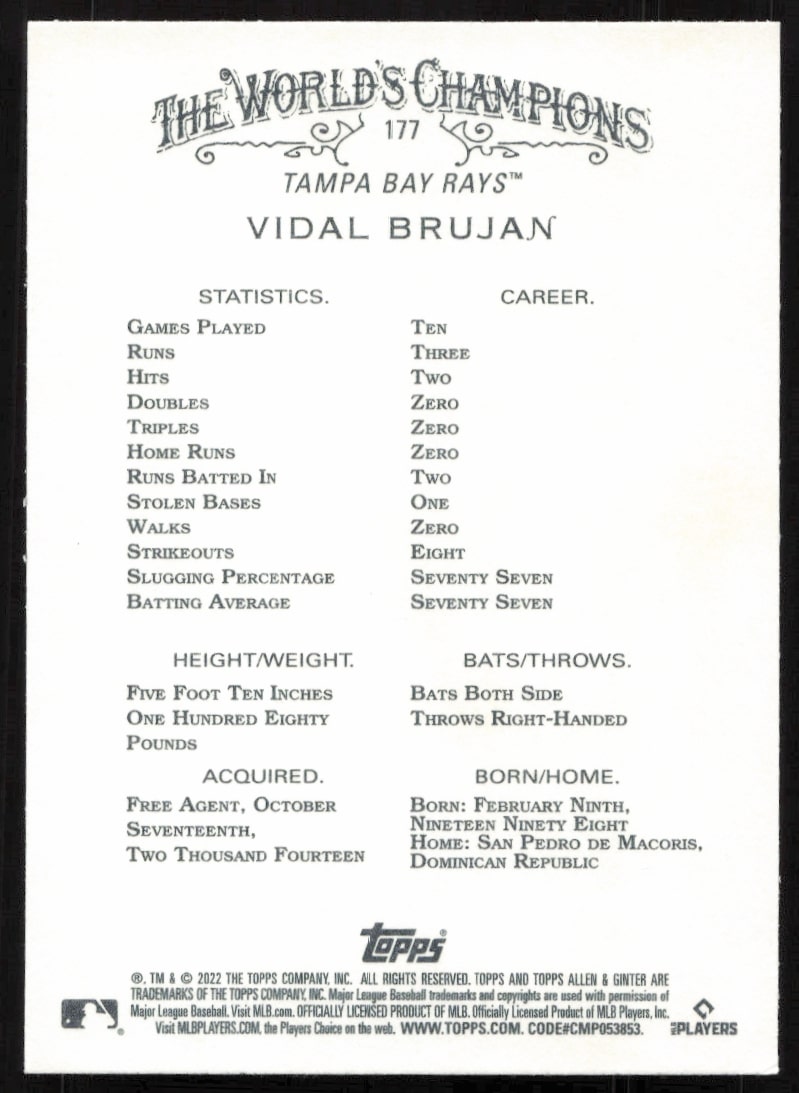 This Baseball card, from 2022 is part of the Topps Allen & Ginter card set. Vidal Brujan is featured and has a card number of 177.