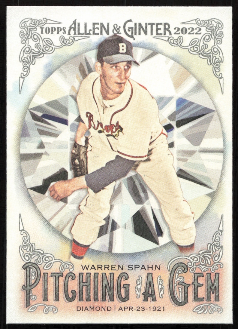 This Baseball card, from 2022 is part of the Topps Allen & Ginter card set. Warren Spahn is featured and has a card number of PAG-2.