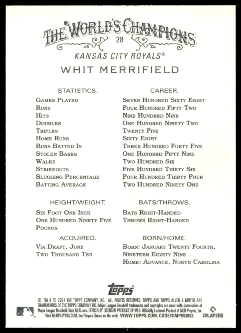 This Baseball card, from 2022 is part of the Topps Allen & Ginter card set. Whit Merrifield is featured and has a card number of 28.
