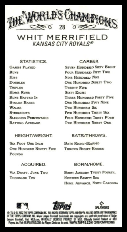 This Baseball card, from 2022 is part of the Topps Allen & Ginter card set. Whit Merrifield is featured and has a card number of 28.