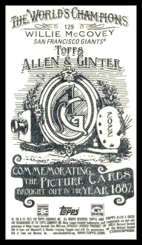 This Baseball card, from 2022 is part of the Topps Allen & Ginter card set. Willie McCovey is featured and has a card number of 129.