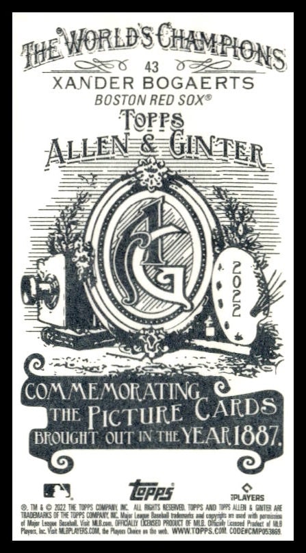 This Baseball card, from 2022 is part of the Topps Allen & Ginter card set. Xander Bogaerts is featured and has a card number of 43.