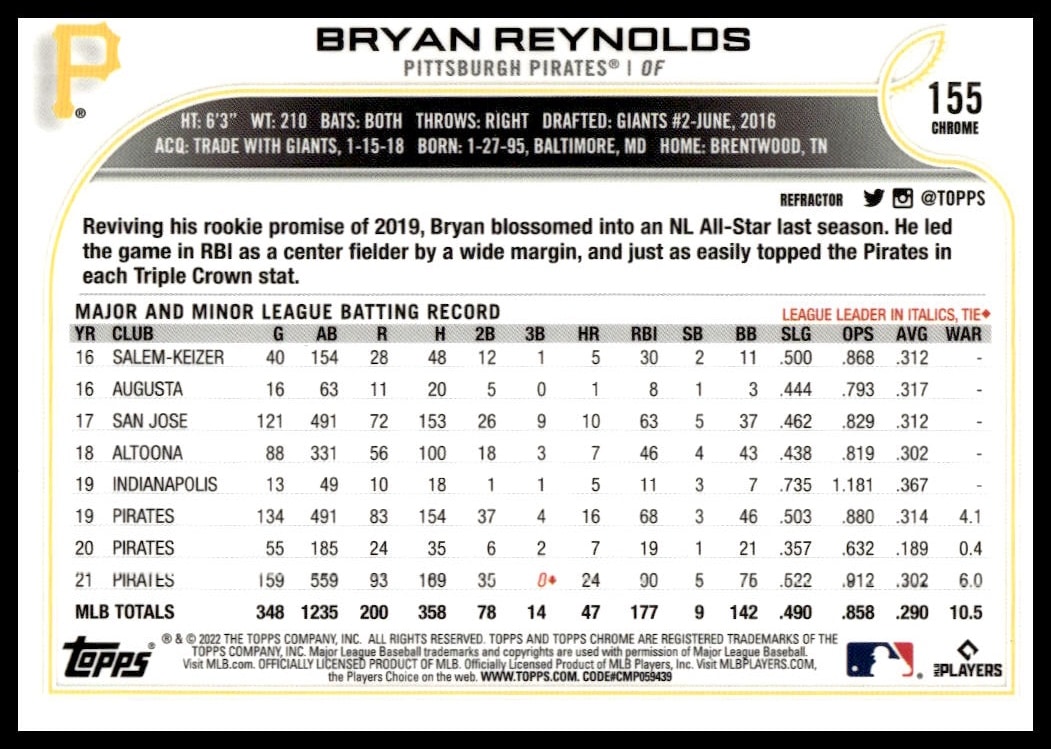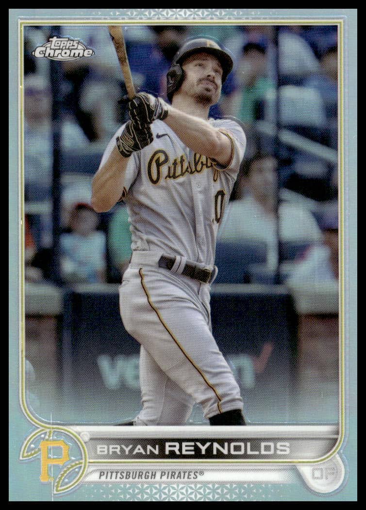 This BaseballΒ card, from 2022 is part of the Topps ChromeΒ card set. Bryan Reynolds is featured and has a card number of 155.