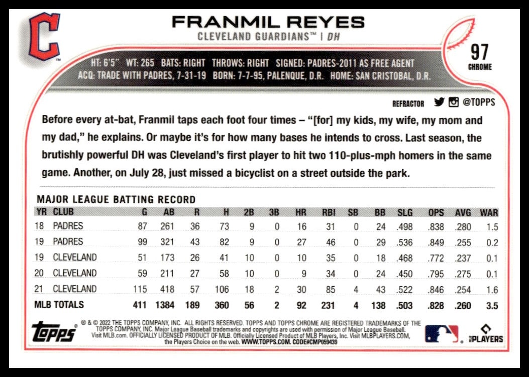 This BaseballΒ card, from 2022 is part of the Topps ChromeΒ card set. Franmil Reyes is featured and has a card number of 97.