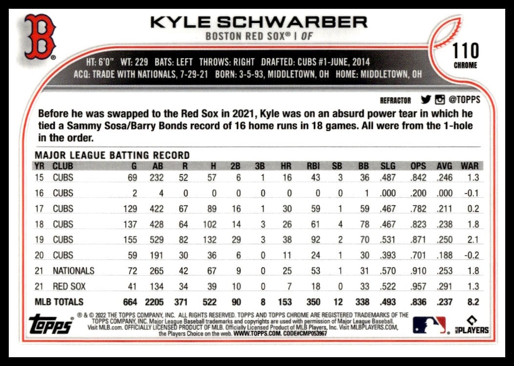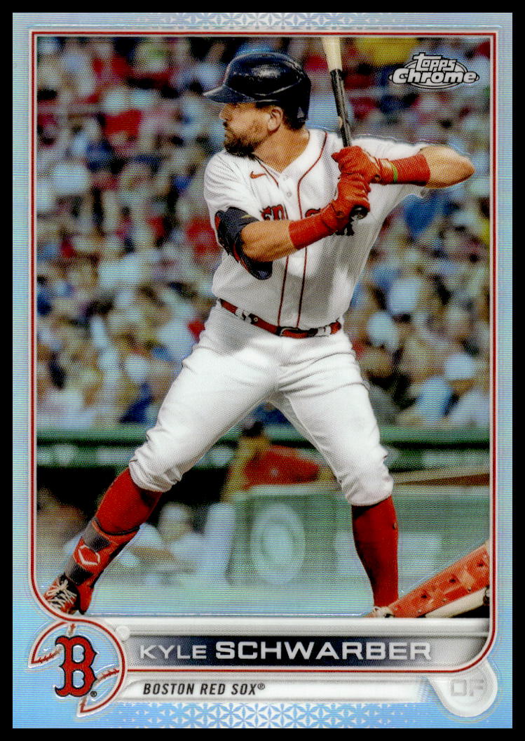 This BaseballΒ card, from 2022 is part of the Topps ChromeΒ card set. Kyle Schwarber is featured and has a card number of 110.