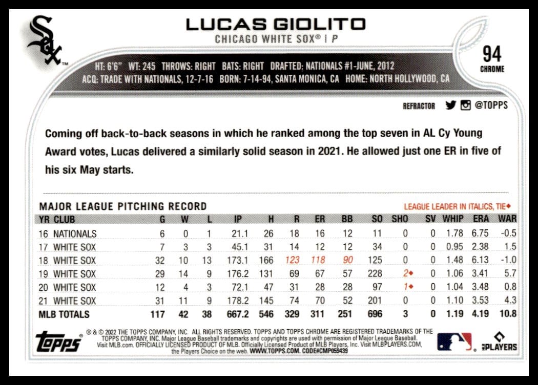 This BaseballΒ card, from 2022 is part of the Topps ChromeΒ card set. Lucas Giolito is featured and has a card number of 94.