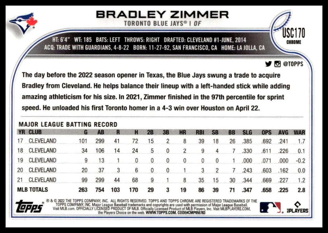 This BaseballΒ card, from 2022 is part of the Topps Chrome UpdateΒ card set. Bradley Zimmer is featured and has a card number of USC170.