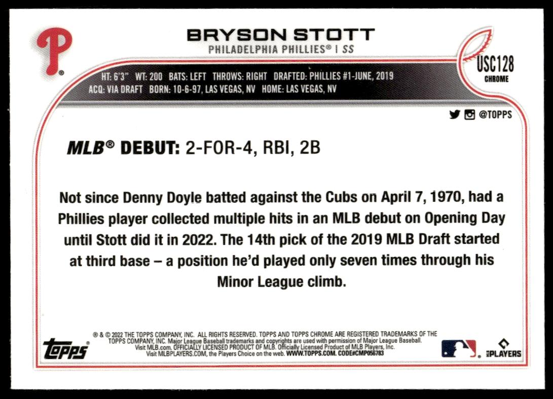This BaseballΒ card, from 2022 is part of the Topps Chrome UpdateΒ card set. Bryson Stott is featured and has a card number of USC128.