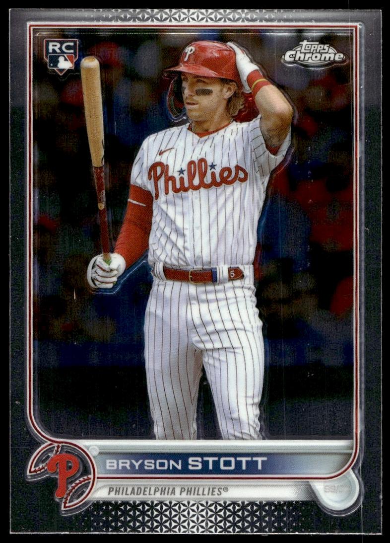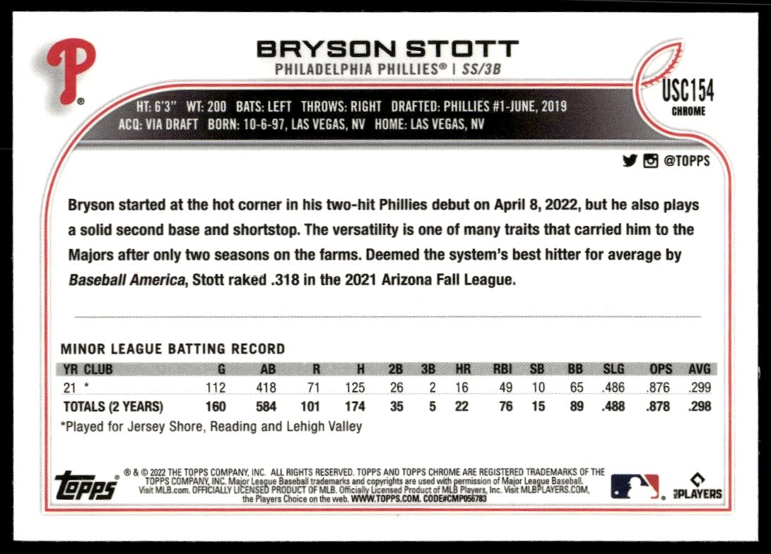 This BaseballΒ card, from 2022 is part of the Topps Chrome UpdateΒ card set. Bryson Stott is featured and has a card number of USC154.