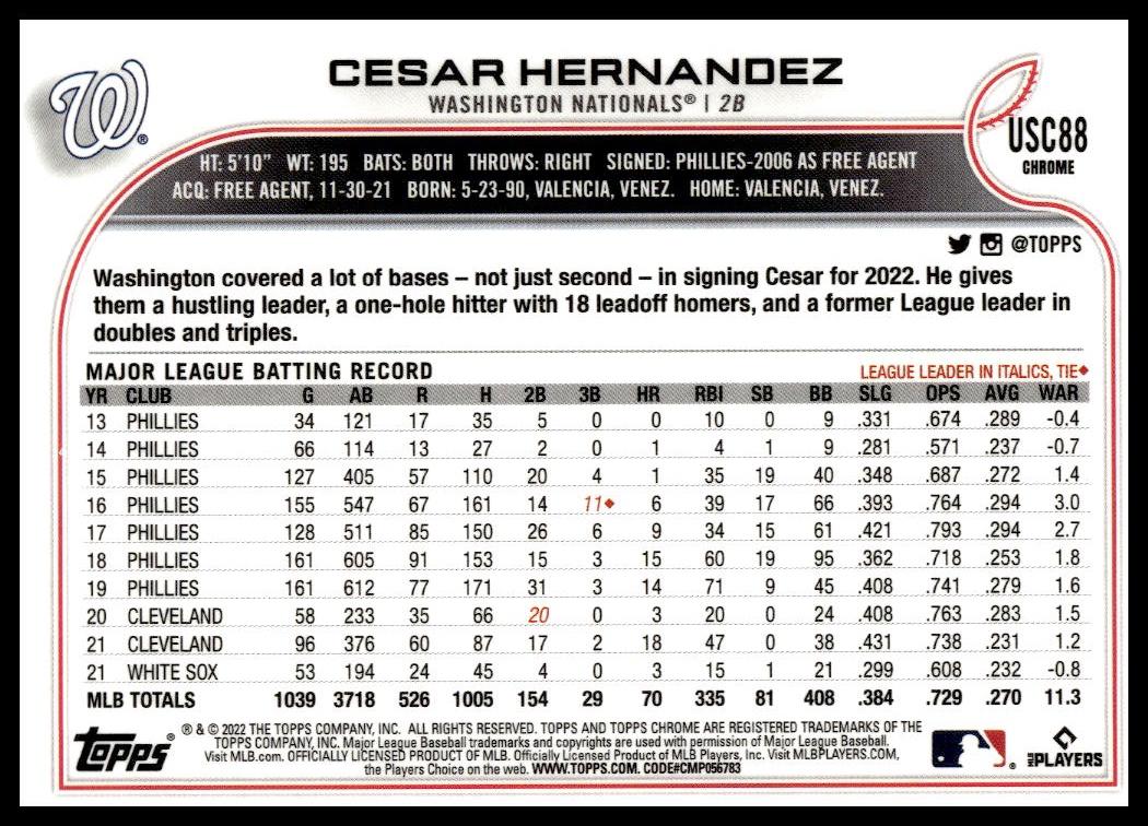 This BaseballΒ card, from 2022 is part of the Topps Chrome UpdateΒ card set. Cesar Hernandez is featured and has a card number of USC88.