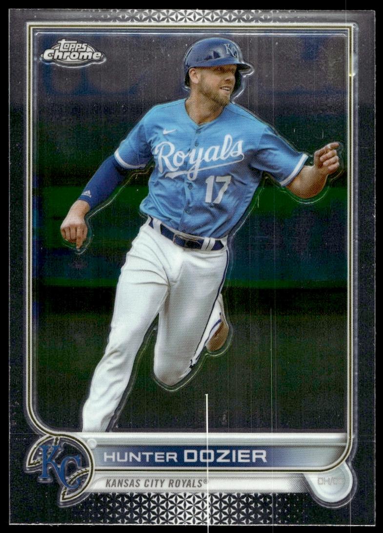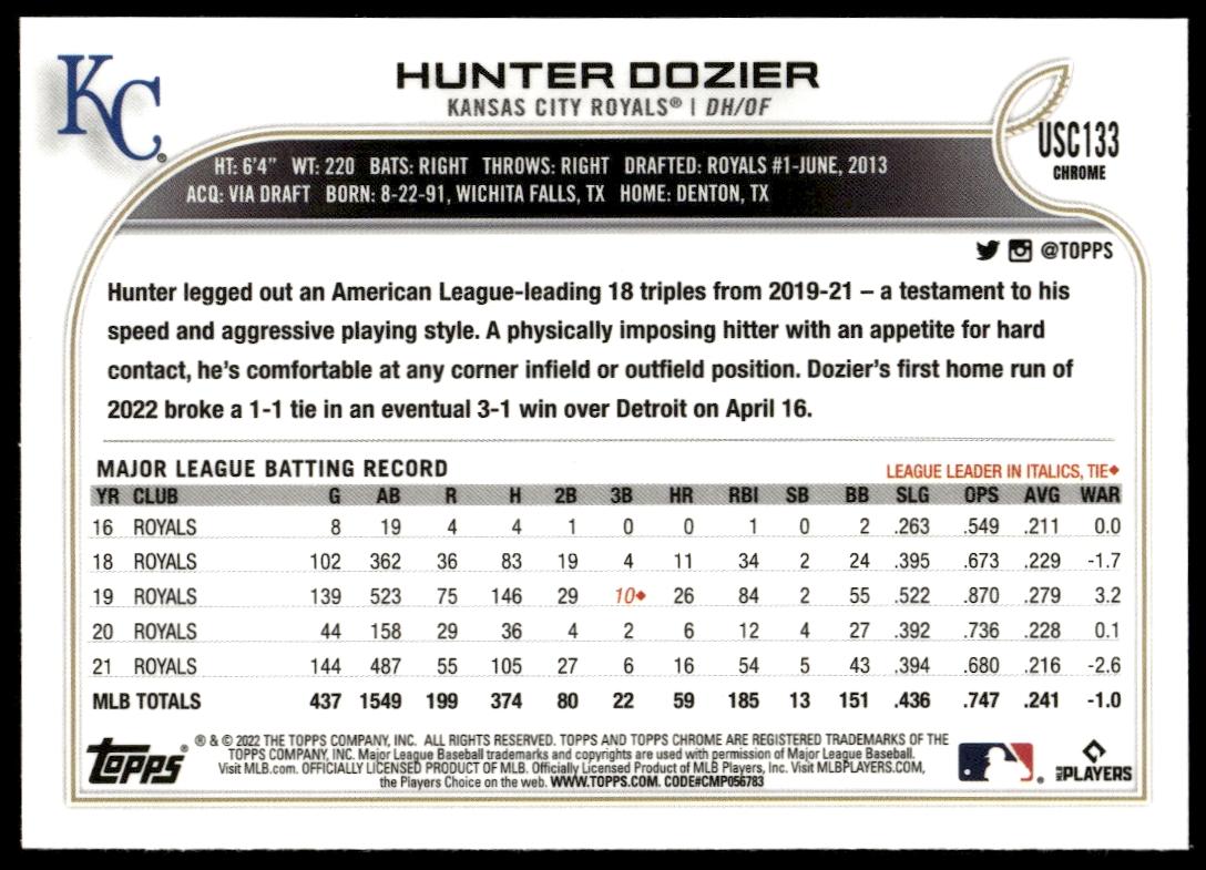 This Baseball card, from 2022 is part of the Topps Chrome Update card set. Hunter Dozier is featured and has a card number of USC133.