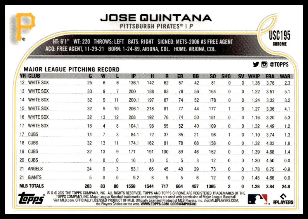 This BaseballΒ card, from 2022 is part of the Topps Chrome UpdateΒ card set. Jose Quintana is featured and has a card number of USC195.