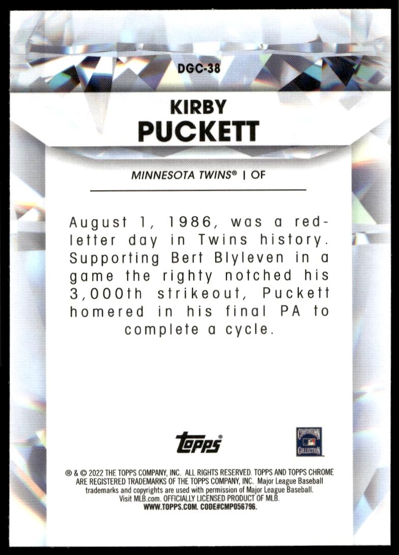This BaseballΒ card, from 2022 is part of the Topps Chrome UpdateΒ card set. Kirby Puckett is featured and has a card number of DGC-38.