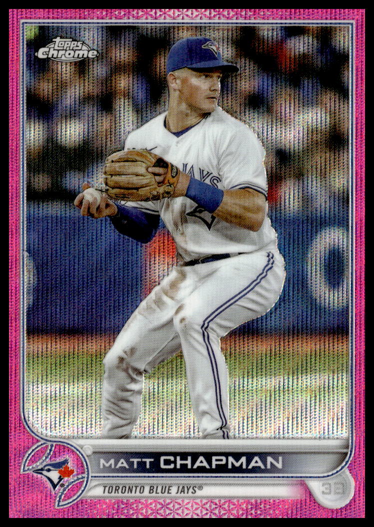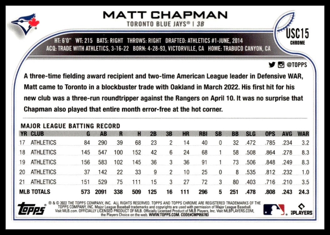 This Baseball card, from 2022 is part of the Topps Chrome Update card set. Matt Chapman is featured and has a card number of USC15.