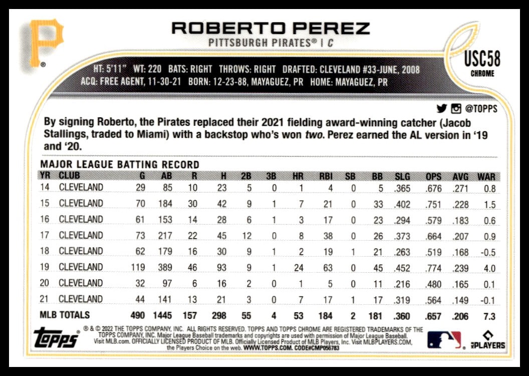 This BaseballΒ card, from 2022 is part of the Topps Chrome UpdateΒ card set. Roberto Perez is featured and has a card number of USC58.