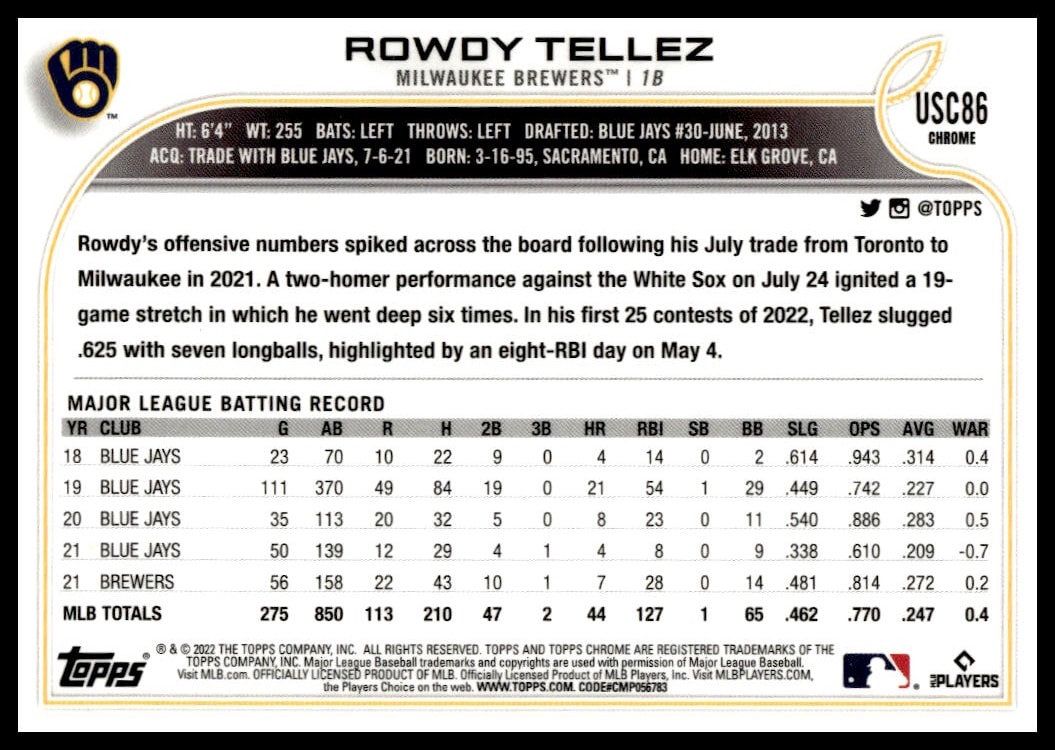 This BaseballΒ card, from 2022 is part of the Topps Chrome UpdateΒ card set. Rowdy Tellez is featured and has a card number of USC86.