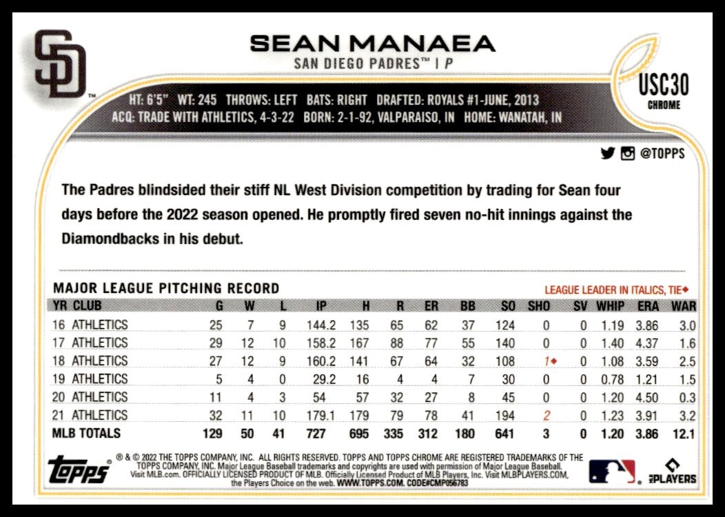 This Baseball card, from 2022 is part of the Topps Chrome Update card set. Sean Manaea is featured and has a card number of USC30.