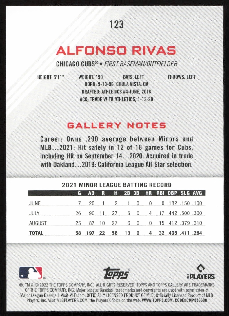 This Baseball card, from 2022 is part of the Topps Gallery card set. Alfonso Rivas is featured and has a card number of 123.