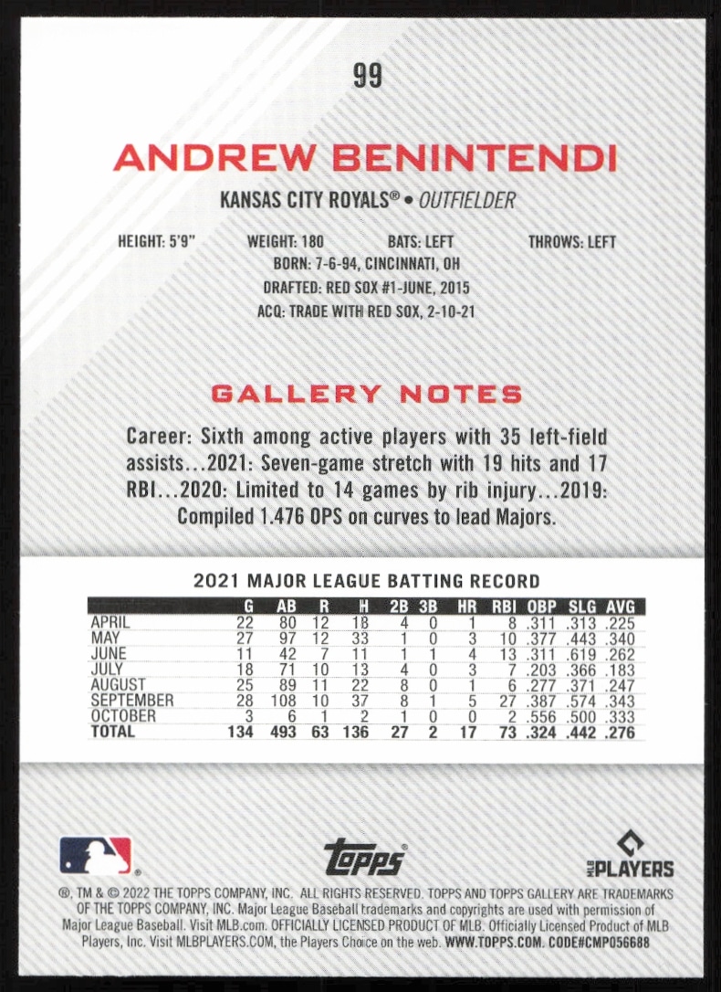 This Baseball card, from 2022 is part of the Topps Gallery card set. Andrew Benintendi is featured and has a card number of 99.