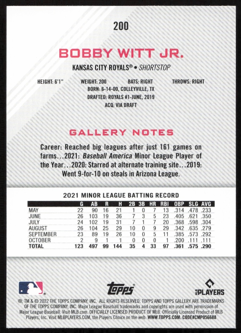 This Baseball card, from 2022 is part of the Topps Gallery card set. Bobby Witt Jr. is featured and has a card number of 200.