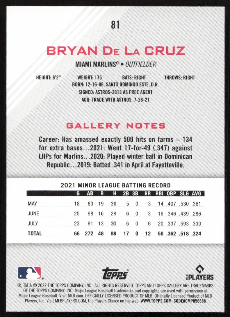 This Baseball card, from 2022 is part of the Topps Gallery card set. Bryan De La Cruz is featured and has a card number of 81.
