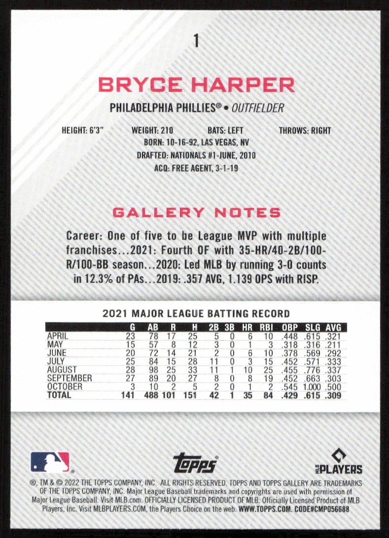 This Baseball card, from 2022 is part of the Topps Gallery card set. Bryce Harper is featured and has a card number of 1.