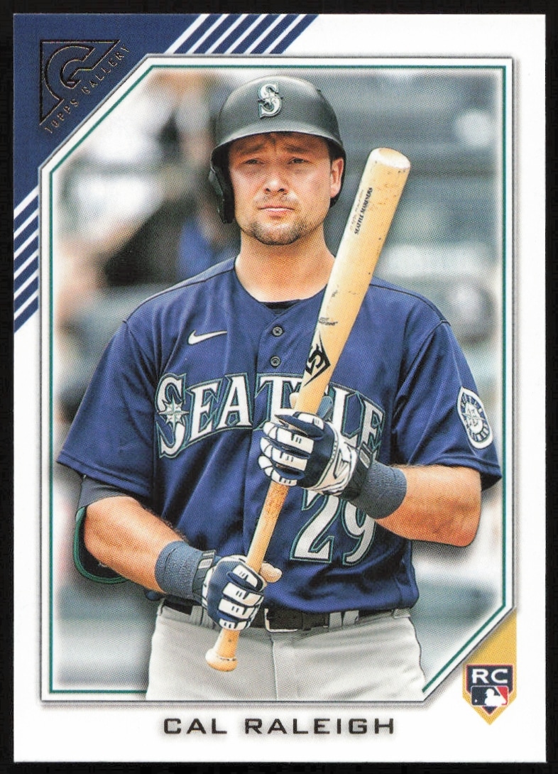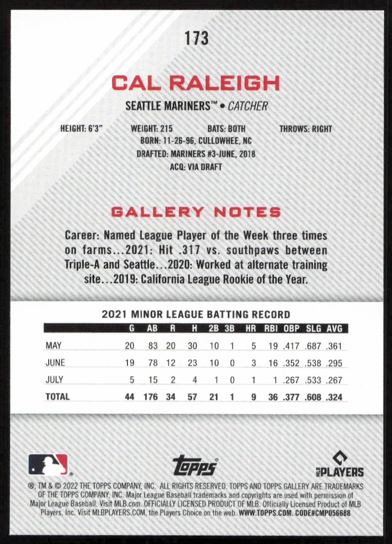This Baseball card, from 2022 is part of the Topps Gallery card set. Cal Raleigh is featured and has a card number of 173.