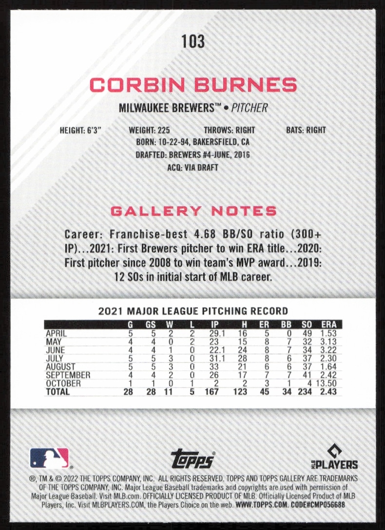 This Baseball card, from 2022 is part of the Topps Gallery card set. Corbin Burnes is featured and has a card number of 103.