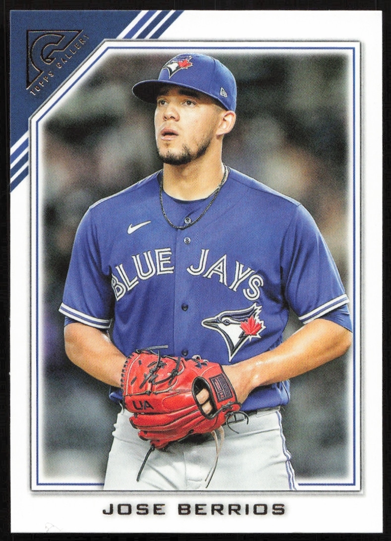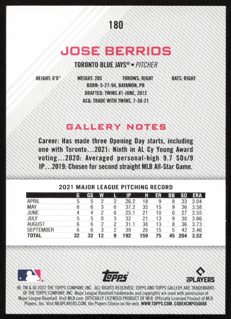 This Baseball card, from 2022 is part of the Topps Gallery card set. Jose Berrios is featured and has a card number of 180.