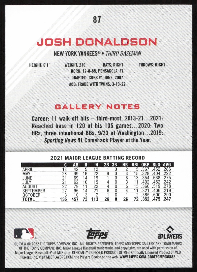 This Baseball card, from 2022 is part of the Topps Gallery card set. Josh Donaldson is featured and has a card number of 87.