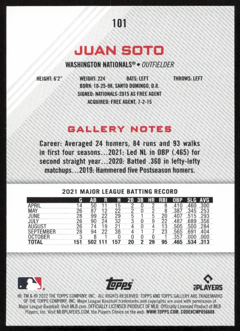 This Baseball card, from 2022 is part of the Topps Gallery card set. Juan Soto is featured and has a card number of 101.