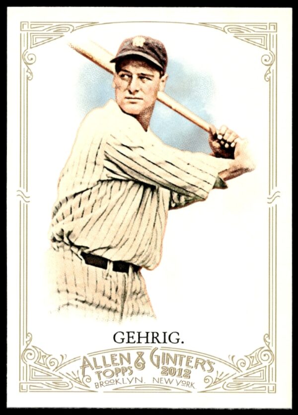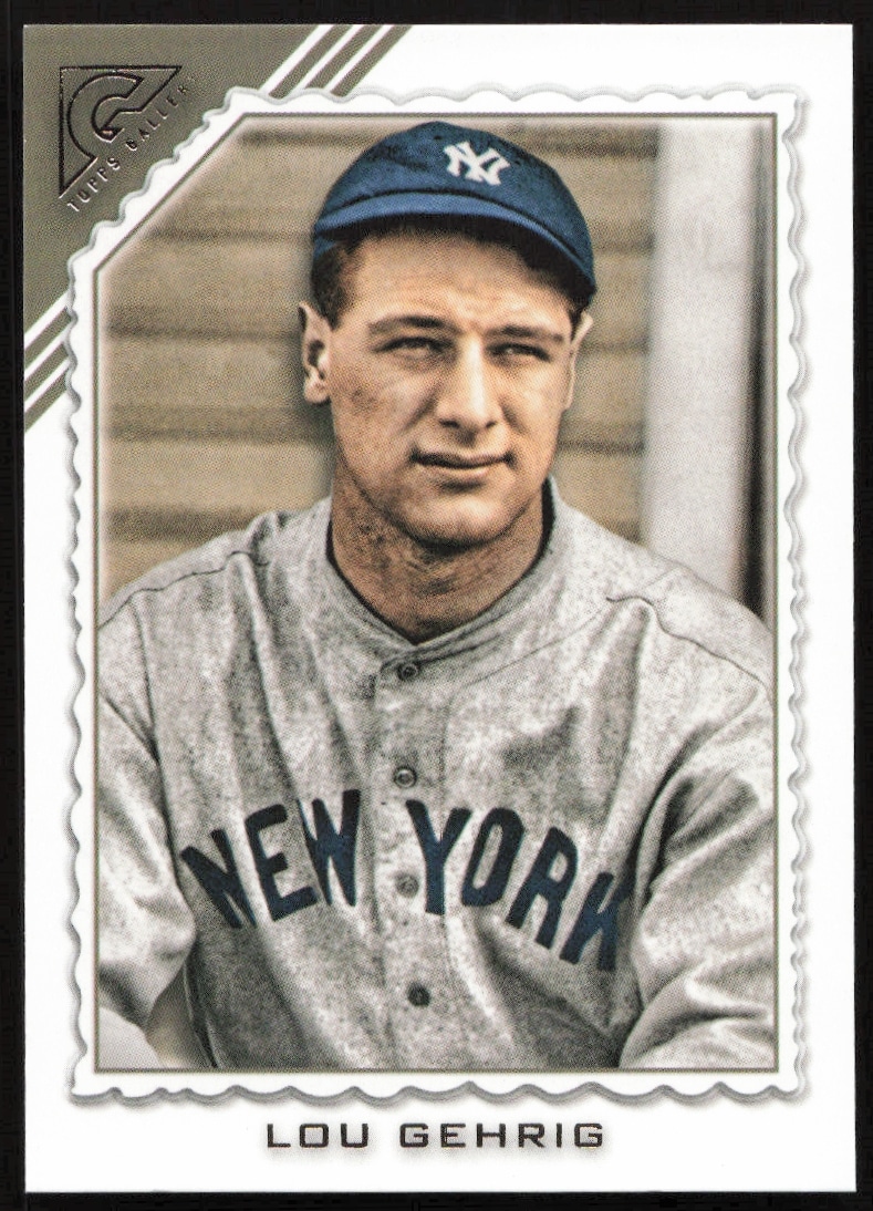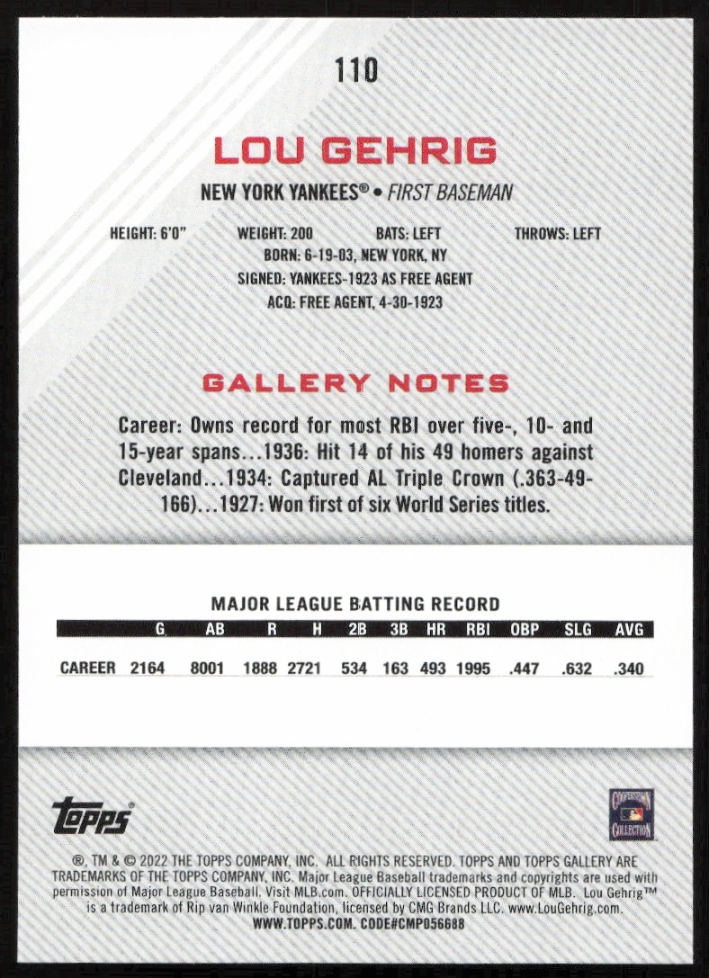 This Baseball card, from 2022 is part of the Topps Gallery card set. Lou Gehrig is featured and has a card number of 110.