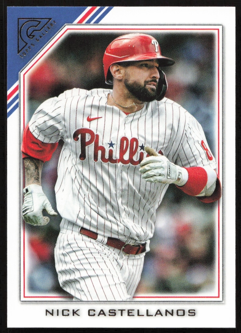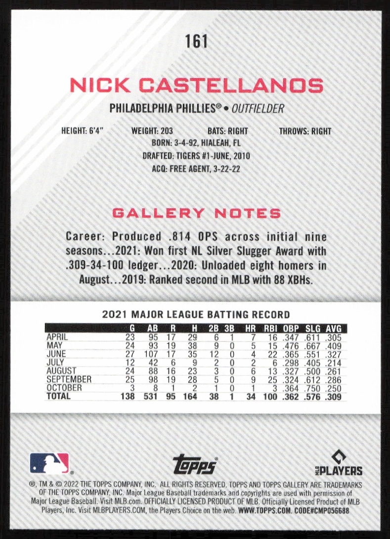 This Baseball card, from 2022 is part of the Topps Gallery card set. Nick Castellanos is featured and has a card number of 161.