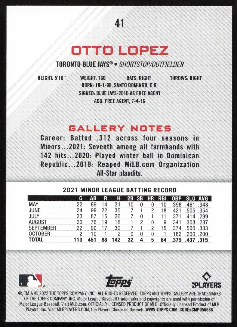 This Baseball card, from 2022 is part of the Topps Gallery card set. Otto Lopez is featured and has a card number of 41.