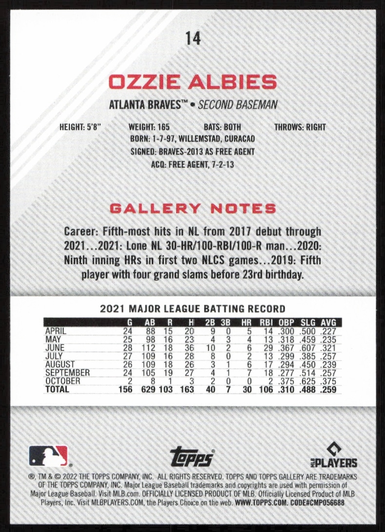 This Baseball card, from 2022 is part of the Topps Gallery card set. Ozzie Albies is featured and has a card number of 14.