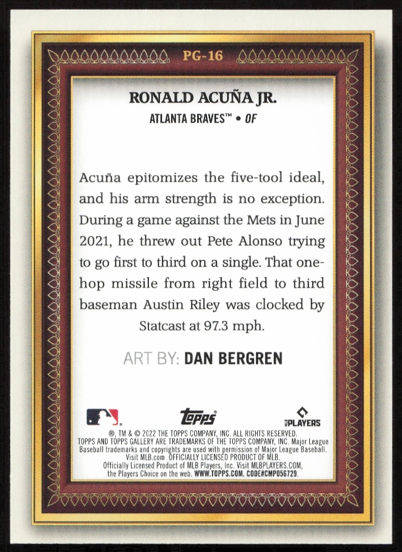 This Baseball card, from 2022 is part of the Topps Gallery card set. Ronald Acuña Jr. is featured and has a card number of PG-16.