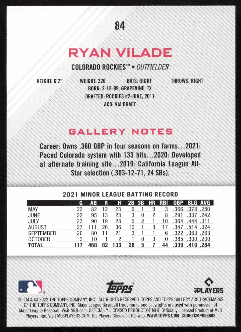 This Baseball card, from 2022 is part of the Topps Gallery card set. Ryan Vilade is featured and has a card number of 84.