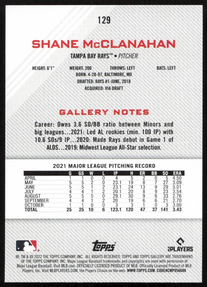 This Baseball card, from 2022 is part of the Topps Gallery card set. Shane McClanahan is featured and has a card number of 129.