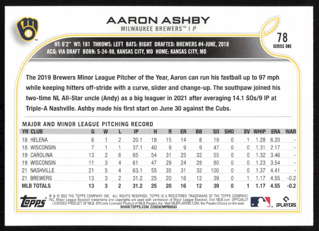 This Baseball card, from 2022 is part of the Topps Series 1 card set. Aaron Ashby is featured and has a card number of 78.