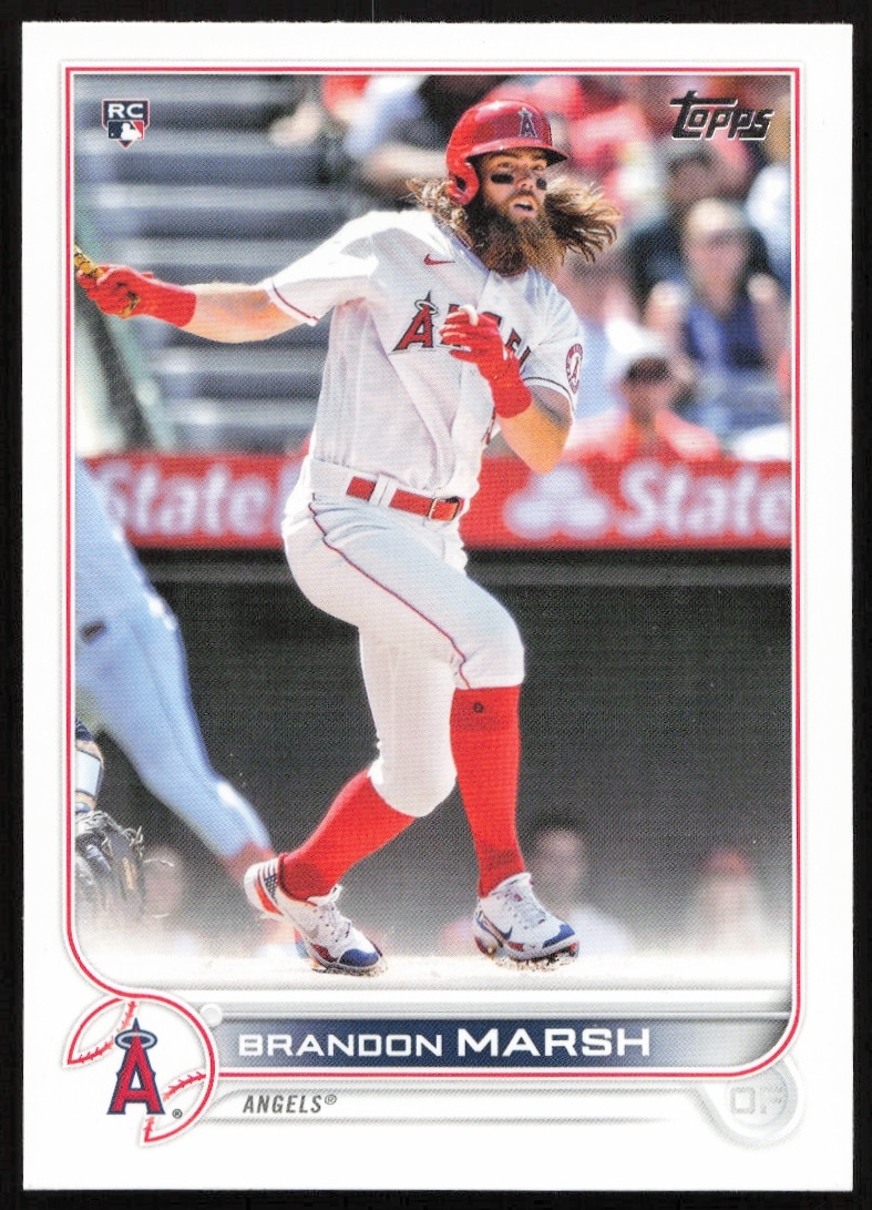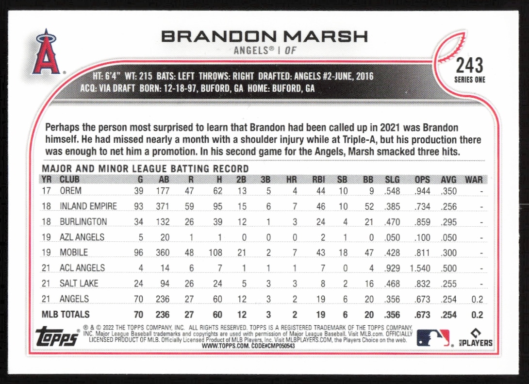 This Baseball card, from 2022 is part of the Topps Series 1 card set. Brandon Marsh is featured and has a card number of 243.