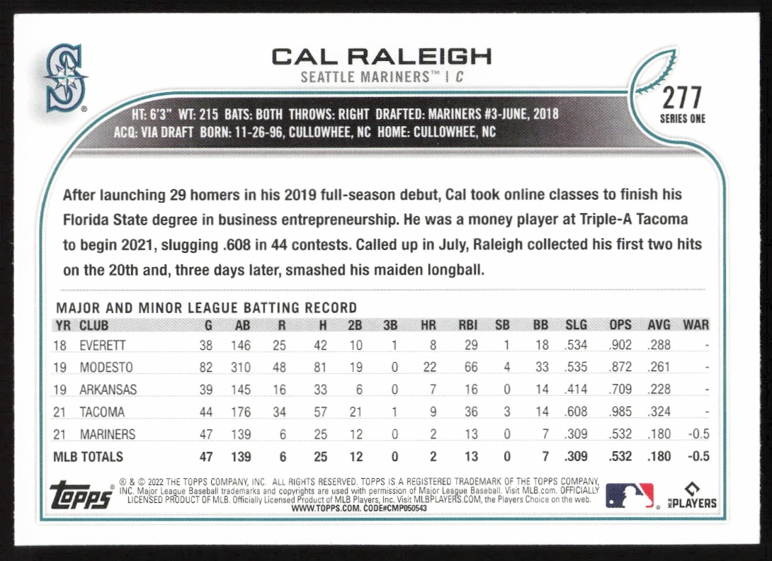 This Baseball card, from 2022 is part of the Topps Series 1 card set. Cal Raleigh is featured and has a card number of 277.