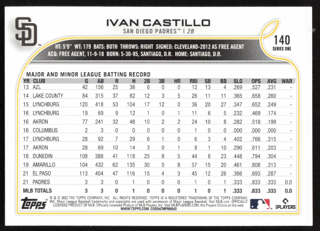 This Baseball card, from 2022 is part of the Topps Series 1 card set. Ivan Castillo is featured and has a card number of 140.