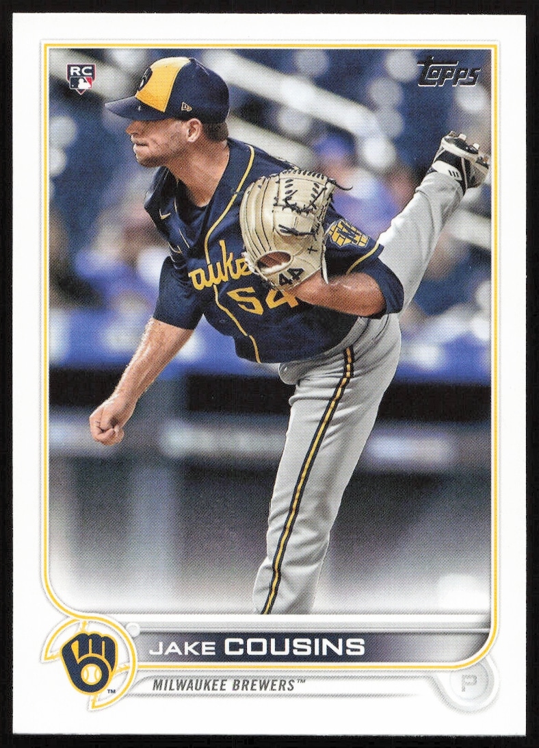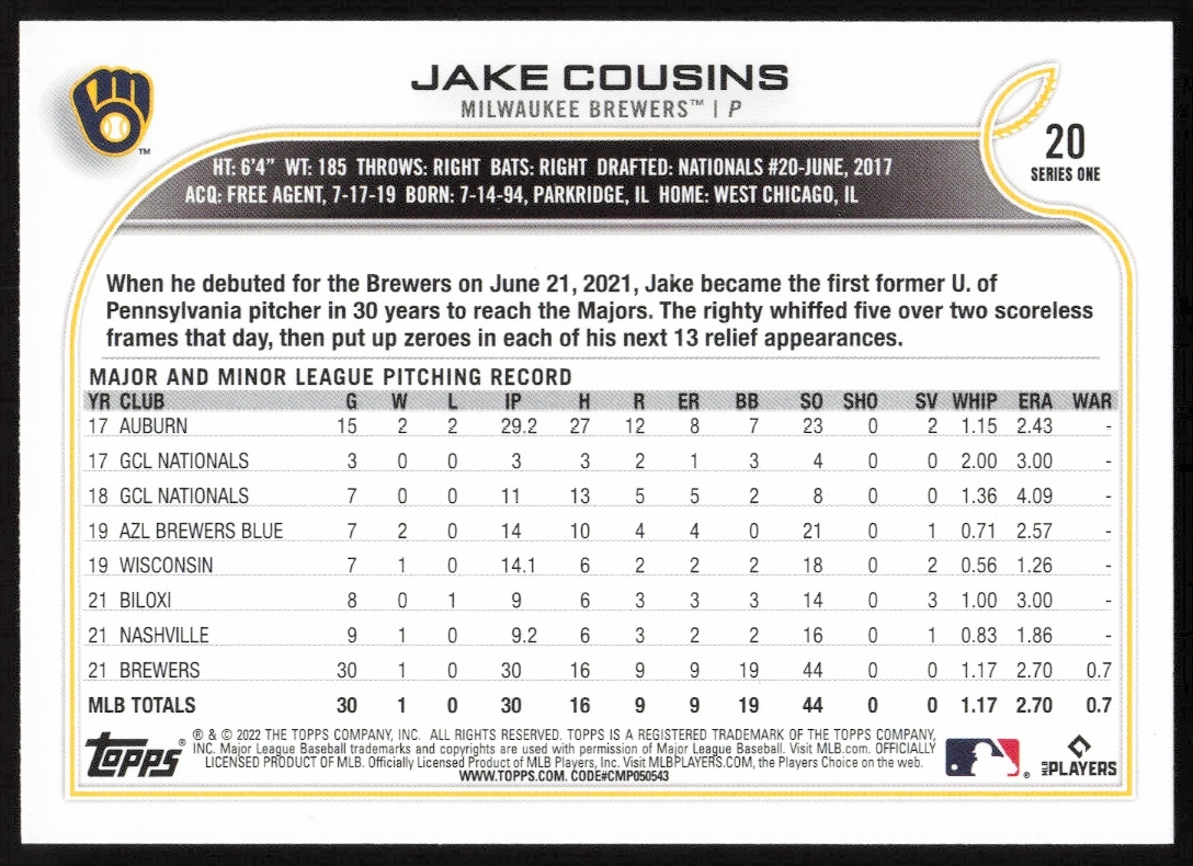 This Baseball card, from 2022 is part of the Topps Series 1 card set. Jake Cousins is featured and has a card number of 20.