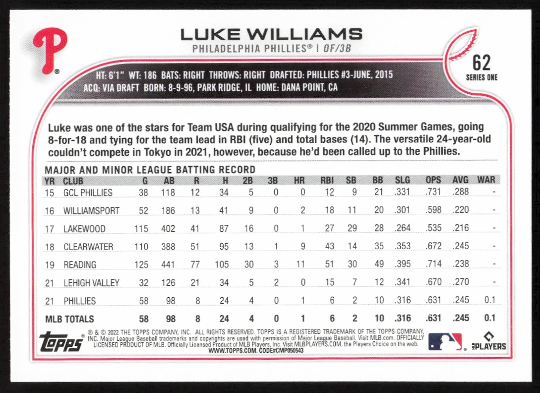 This Baseball card, from 2022 is part of the Topps Series 1 card set. Luke Williams is featured and has a card number of 62.