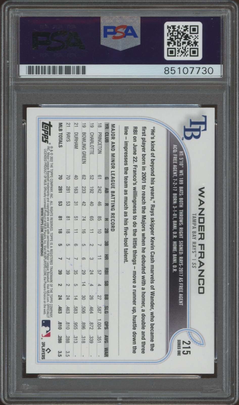 This Baseball card, from 2022 is part of the Topps card set. Wander Franco is featured and has a card number of 215. It is certified by PSA / DNA as authentic.