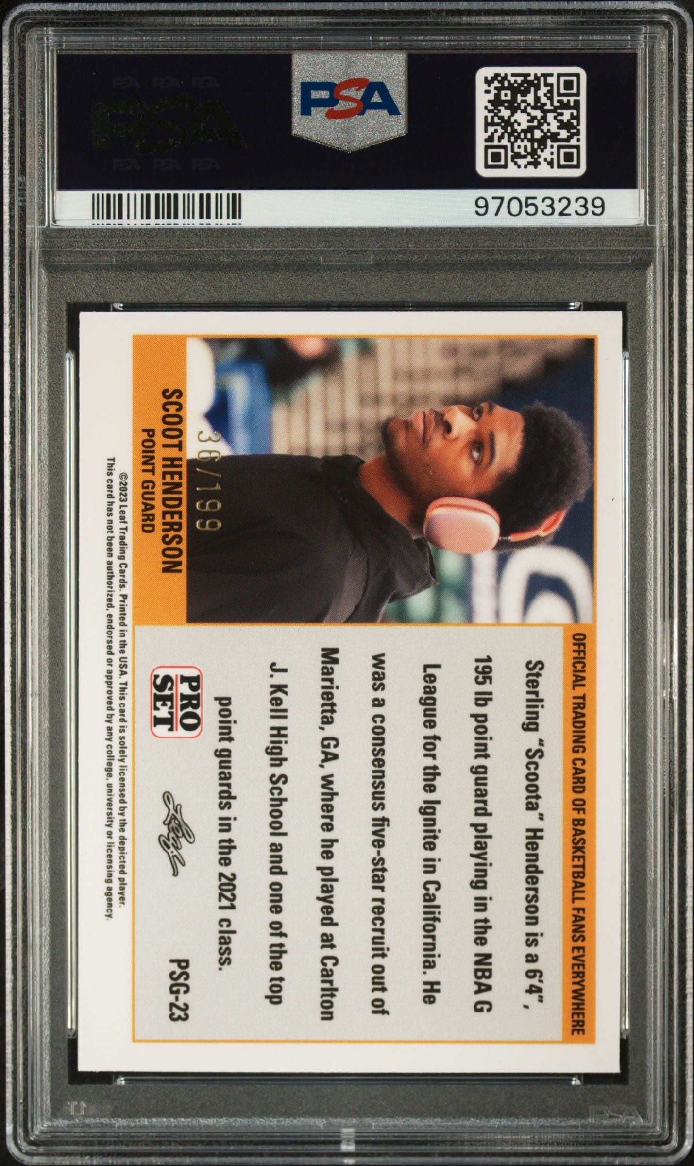 This Basketball card, from 2023 is part of the Leaf Pro Set Metal card set. Scoot Henderson is featured and has a card number of PSG-23. It is graded by PSA and has a numeric grade of 10.
