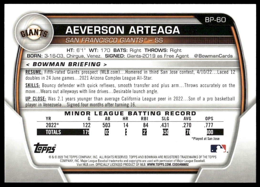 This Baseball card, from 2023 is part of the Bowman card set. Aeverson Arteaga is featured and has a card number of BP-60.