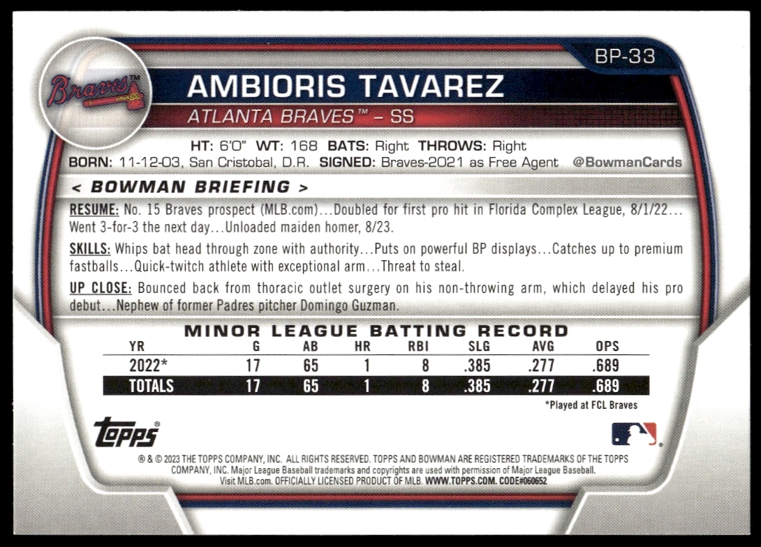 This Baseball card, from 2023 is part of the Bowman card set. Ambioris Tavarez is featured and has a card number of BP-33.