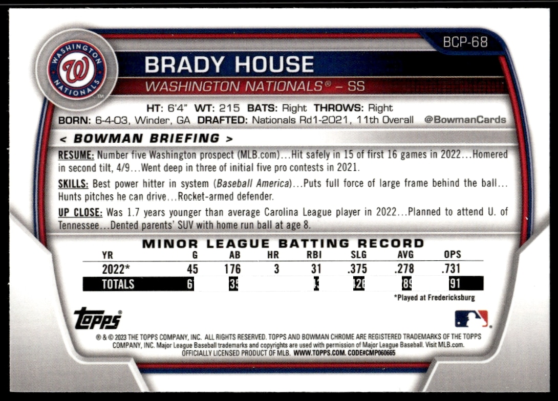This Baseball card, from 2023 is part of the Bowman card set. Brady House is featured and has a card number of BP-68.
